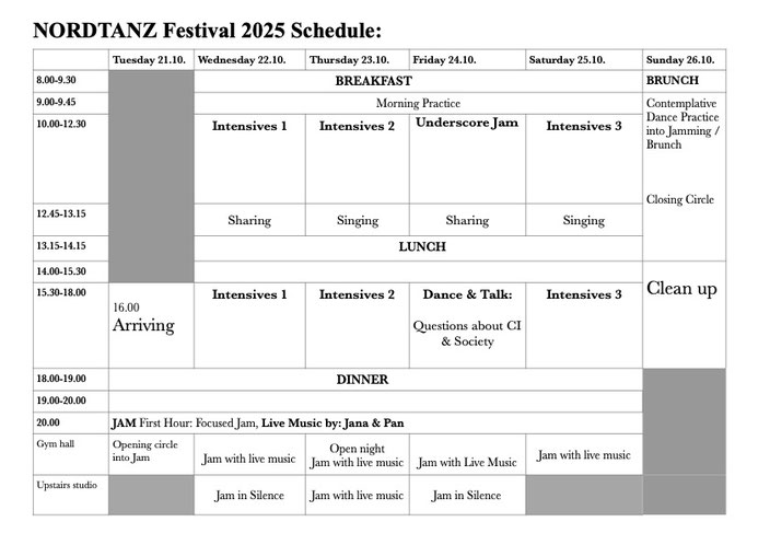 Information about the individual people who give intensives and the people who accompany the NORDTANZ musically can then be found via the menu on the left! Here you can see the program: